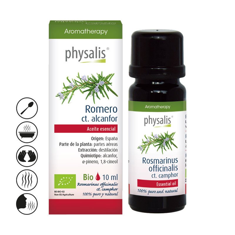 El aceite esencial de Romero ct. Alcanfor de Physalis, con nombre botánico Rosmarinus officinalis ct. camphor, es un producto de origen 100% natural y bioquímicamente definido, obtenido a partir de la destilación de las partes aéreas de la planta de romero, procedente de España. Este aceite esencial tiene un perfil químico específico, donde destacan compuestos como el alcanfor, el α-pineno y el 1,8-cineol.