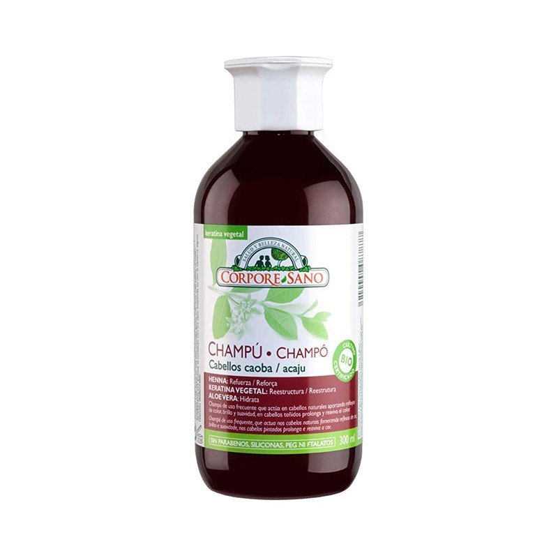 El Champú para cabello Caoba con henna, keratina y aloe vera, reaviva el color, endurece la fibra capilar, refuerza y proporciona brillo y volumen. Es la forma más natural de reforzar la coloración y conseguir un brillo intenso. Este champú con henna Corpore Sano está elaborado para proteger el color del cabello natural o teñido y hacerlo más duradero.