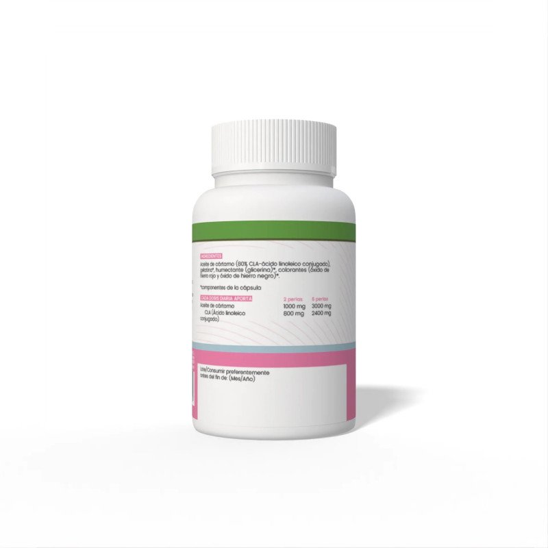 en envases de 90 perlas de 710mg. Cada cápsula contiene 500mg de ácido linoleico conjugado al 80%. Perla de gelatina y glicerina.