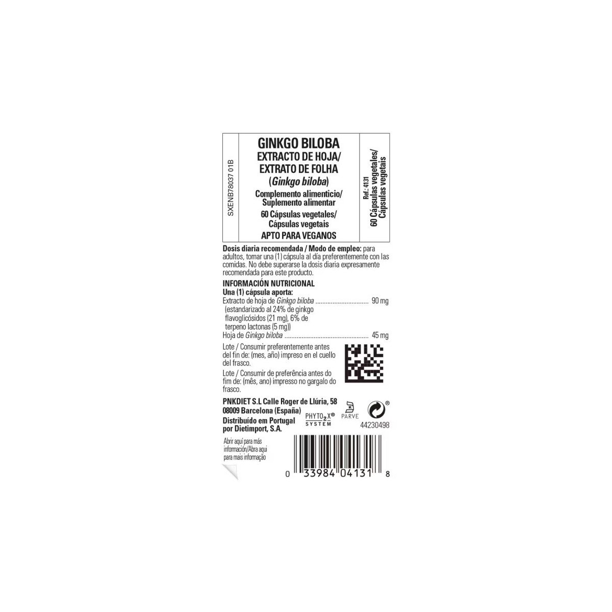 Agente de carga (celulosa microcristalina), extracto de hoja de Ginkgo biloba en polvo, agente de recubrimiento (hidroxipropilmetilcelulosa), hoja de Ginkgo biloba en polvo, antiaglomerante (estearato de magnesio), antioxidantes (beta-caroteno, ácido L-ascórbico).