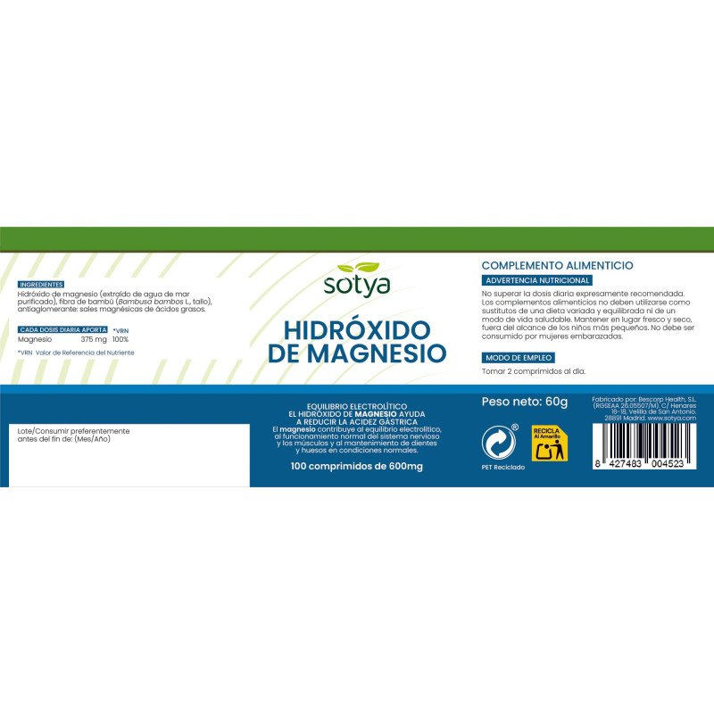 Hidroxido de magnesio (Mg marino) 600mg 100 comprimidos SotyaHidroxido de magnesio (Mg marino) 600mg 100 comprimidos Sotya