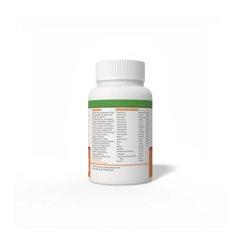Agente de recubrimiento: cápsula vegetal (gelatina), levadura de cerveza (Saccharomyces cerevisiae), colágeno hidrolizado, extracto seco de Urtica dioica, extracto seco de Equisetum arvense, cúrcuma en polvo (Curcuma longa), taurina, nicotinamida, D-pantotenato cálcico, ácido paraaminobenzoico, acetato de D-alfa tocoferilo, gluconato de zinc, clorhidrato de piridoxina, riboflavina, mononitrato de tiamina, cianocobalamina, ácido fólico, biotina, colecalciferol, betacaroteno, selenito de sodio.