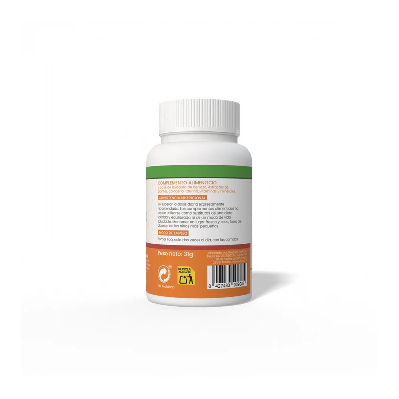Complemento alimenticio formulado con levadura de cerveza, extractos de plantas, colágeno, taurina, vitaminas y minerales, diseñado para fortalecer y mantener en buen estado la piel, el cabello y las uñas. Aporta nutrientes esenciales que actúan desde el interior, ayudando a recuperar el equilibrio natural de los tejidos.