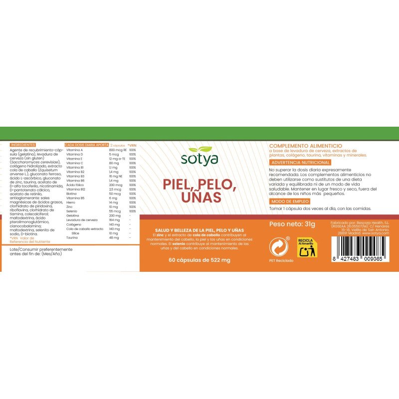 Piel, Pelo y Uñas 522 mg 60 cápsulas Sotya