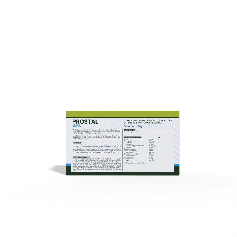 30 cápsulas de 550mg con extractos de Saw Palmetto (Seronea repens), semilla de calabaza ((Cucurbita pepo), té verde hoja (Thea sinensis), trébol flor (Trifolium pratense), romero hoja (Rosmarinus officinalis), tomate fruto (Solanum lycopersicum), y quercetina. Celulosa y estearato como excipientes. Cápsula vegetal de celulosa. Contenido total de polifenoles por cápsula 100mg.