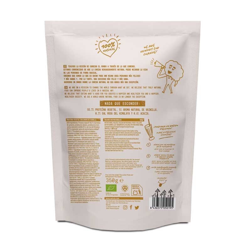 Proteína vegetal* (93.7%) (Proteína de guisante (Pisum sativum), Proteína de cáñamo (Cannabis Sativa), Proteína de arroz (Oryza sativa), Aroma natural de vainilla (5%), Sal rosa del Himalaya (0,7%), Acacia* (0.6%) .
